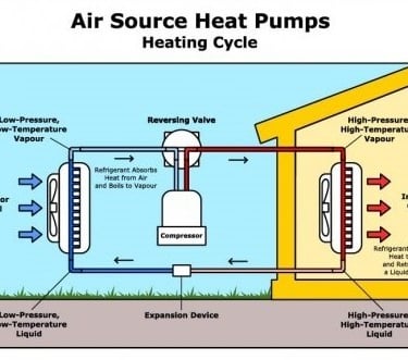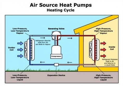 Air Source Heat Pumps: They absorb heat from the outside air and use it to increase the indoor temperature.